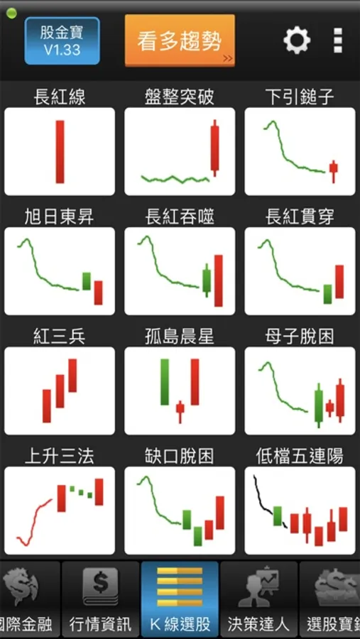 。K 線選股(重點) : 簡易圖像選股,提供多種多空K線型態選股。