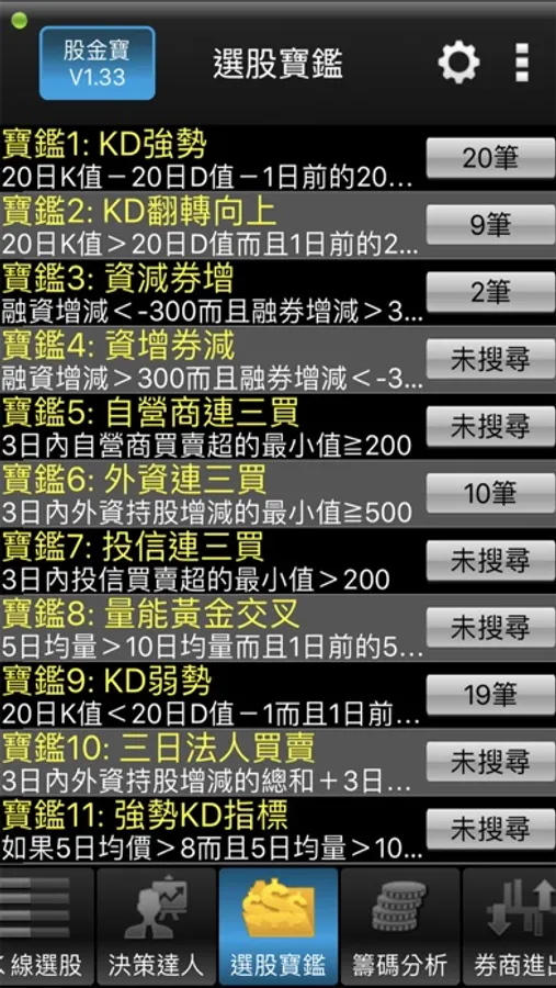 。選股寶鑑(重點) : 提供價量、技術指標、籌碼追蹤、財務營收、數值運算及選股條件等跨邏輯選股方法