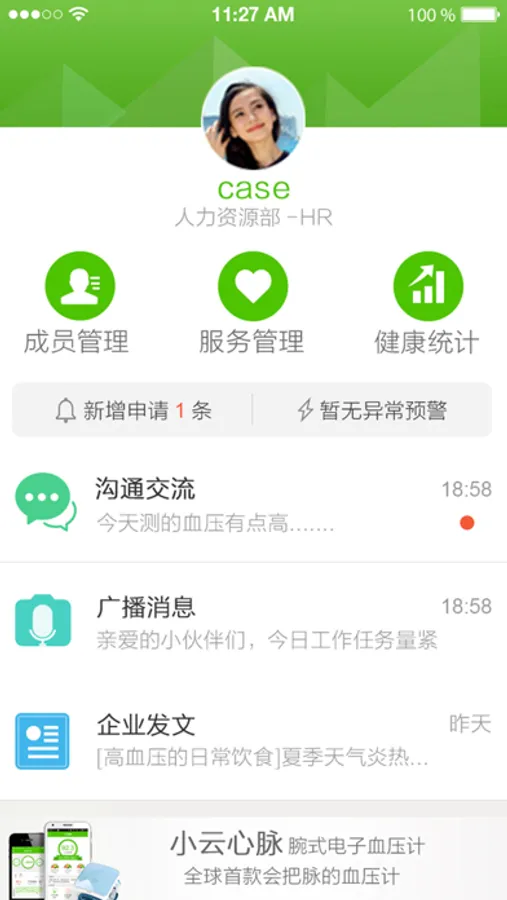 若您是员工,请下载“小云健康”客户端,申请加入企业