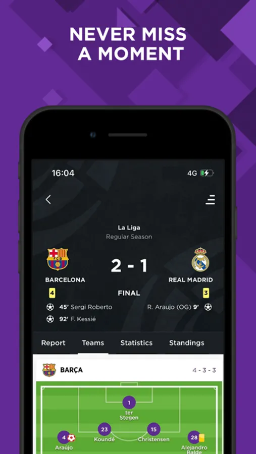 - Live match push notifications. Receive goal and other alerts during live matches of your favorite teams