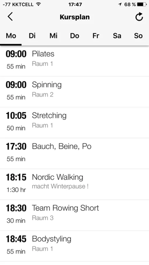 Direkter und aktueller Zugriff auf den Gruppentrainingsplan: Für jeden Kurs können Sie Details wie Zeit, Kursbeschreibung und leitender Trainer einsehen.
