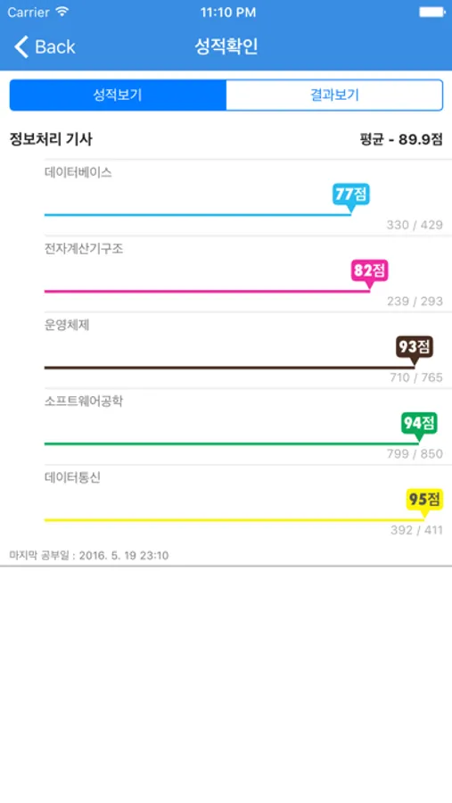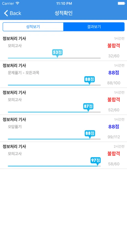 성적확인 - 각 과목별 성적 및 그동안 풀어본 기출문제와 모의고사, 문제풀기의 성적을 볼 수 있습니다.