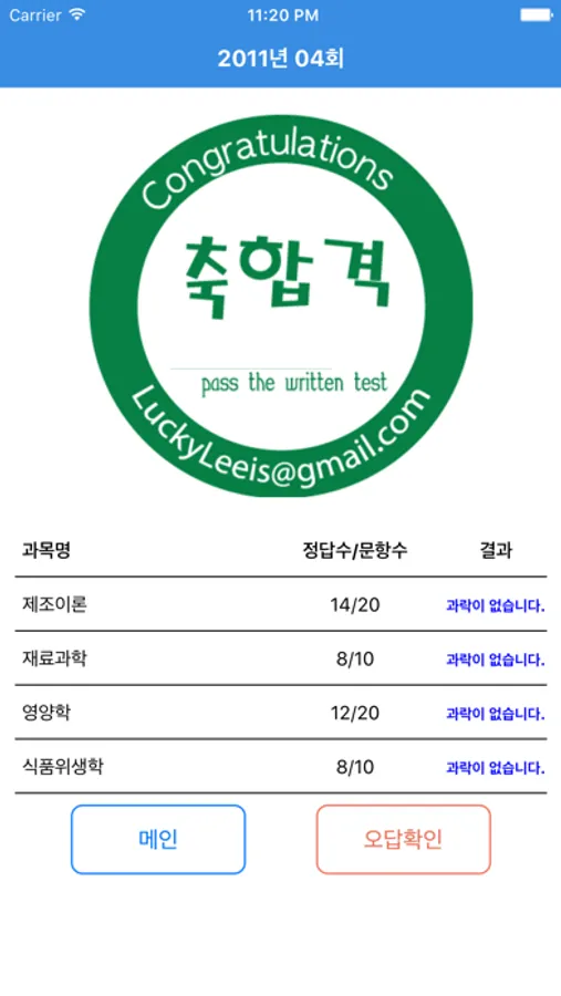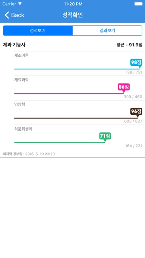 성적확인 - 각 과목별 성적 및 그동안 풀어본 기출문제와 모의고사, 문제풀기의 성적을 볼 수 있습니다.