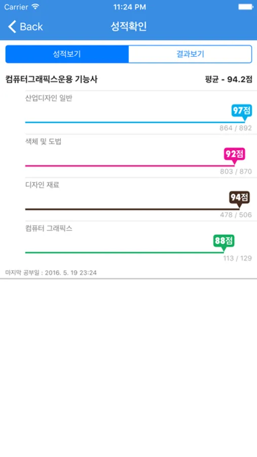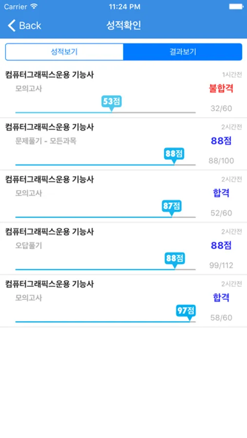 성적확인 - 각 과목별 성적 및 그동안 풀어본 기출문제와 모의고사, 문제풀기의 성적을 볼 수 있습니다.