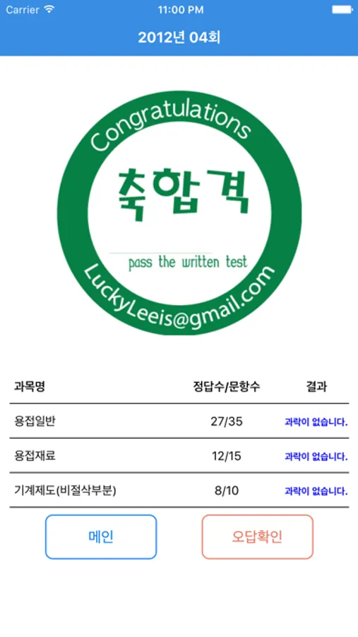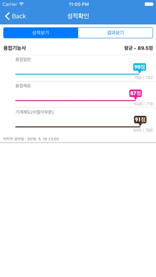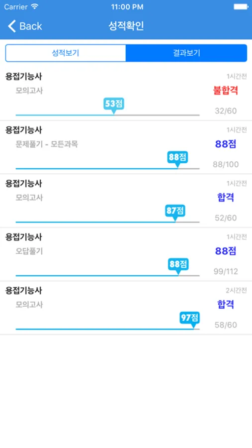 성적확인 - 각 과목별 성적 및 그동안 풀어본 기출문제와 모의고사, 문제풀기의 성적을 볼 수 있습니다.