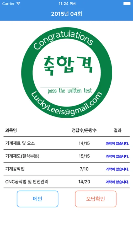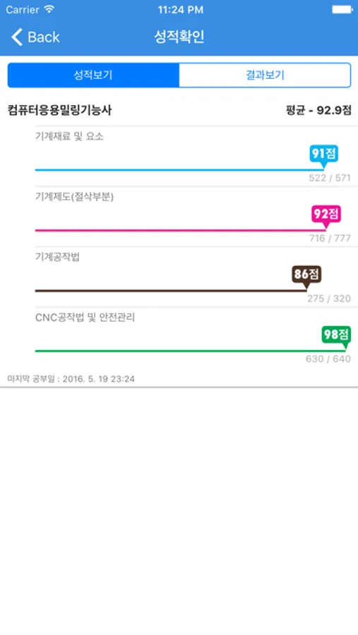 성적확인 - 각 과목별 성적 및 그동안 풀어본 기출문제와 모의고사, 문제풀기의 성적을 볼 수 있습니다.