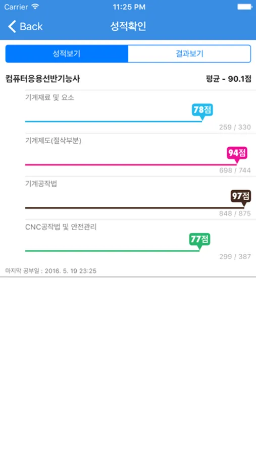 성적확인 - 각 과목별 성적 및 그동안 풀어본 기출문제와 모의고사, 문제풀기의 성적을 볼 수 있습니다.
