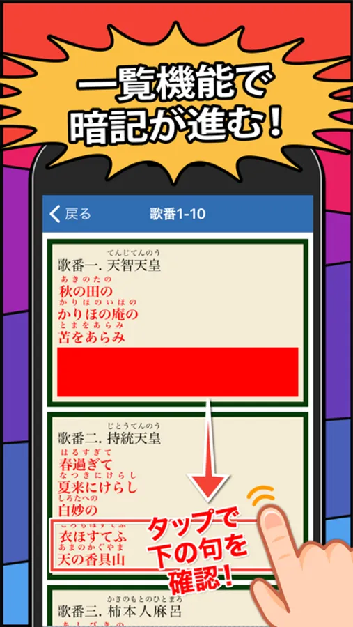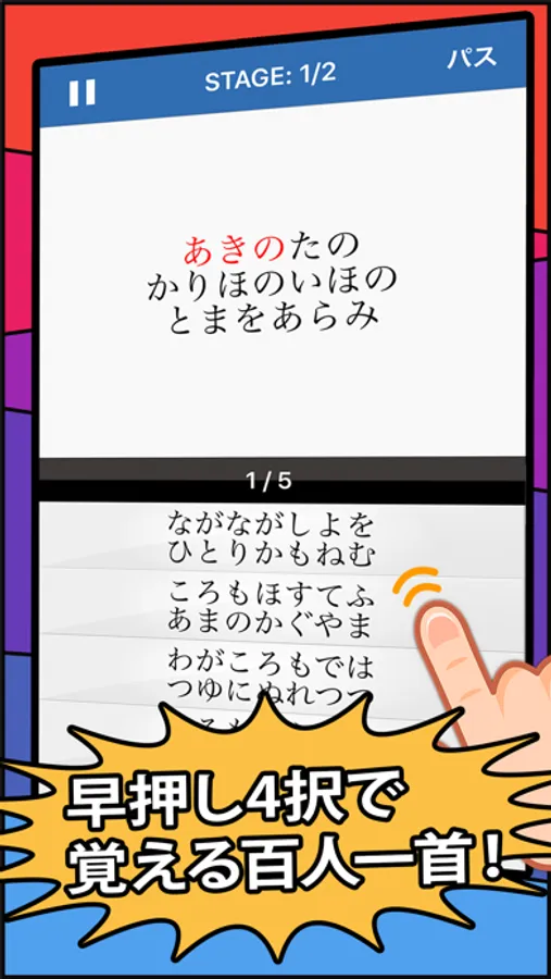 まずはタップしながら百人一首の上の句と下の句の組み合わせを覚えよう。