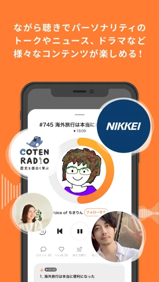 人気ポッドキャストである「コテンラジオ」や「チャポンと行こう!」もVoicyで楽しめます。