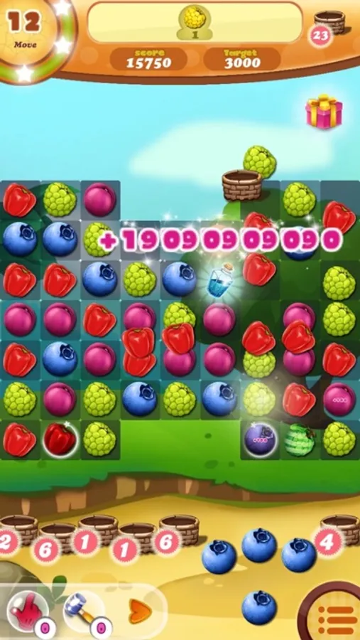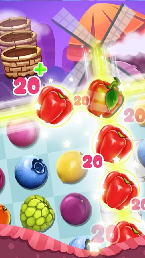 Combine 3 fruits in a line, you will get 3 fruits. Combine 4 fruits, you will receive 4 fruits bonus a fruit basket and 1 featuring fruit that can eat the whole vertical or horizontal row. Combine 5 fruits in a right angle, you can get 5 fruits and bonus two baskets and a fruit that can eat all 9 surrounding fruits. Combine 5 fruits in a line, you can get 5 fruits and bonus 5 baskets, and a god pitcher that can eat all the fruits swiping with it. Beautifully designed with 6 kinds of fruits: mangos, lime fruits, custard-apples, red peppers, plums, pears.