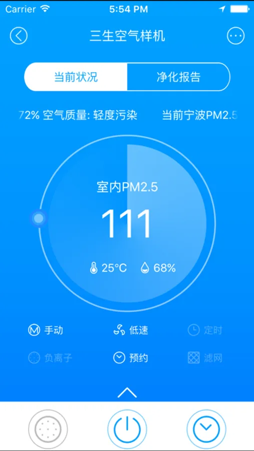 主要控制功能:空气净化器的开关、模式、风速、负离子、定时和预约。