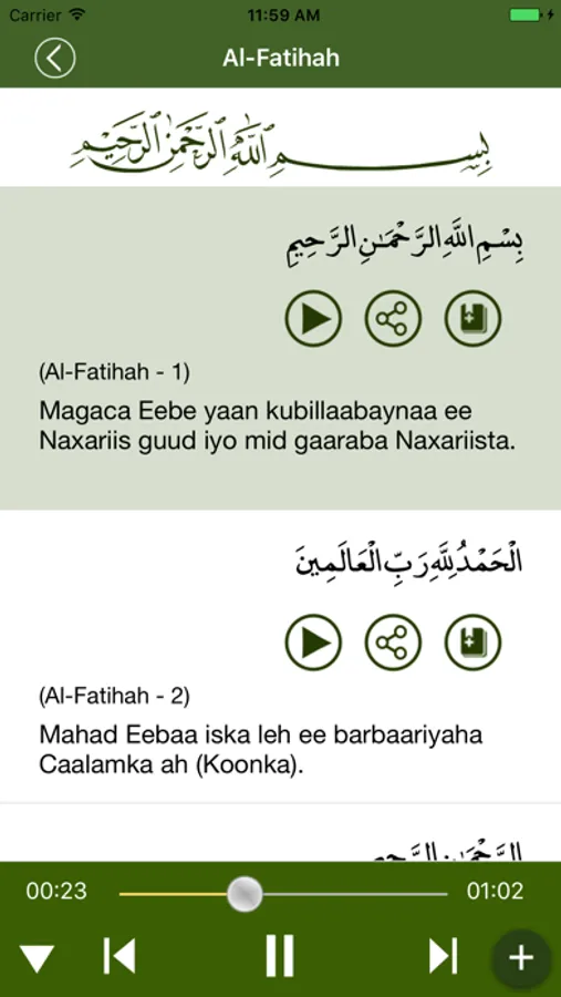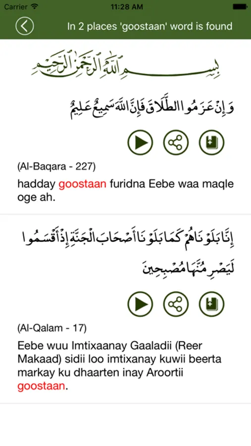 With this Islamic book app, you are getting Hafizi quran with real page-curl experience. This is not just a textual app, it is an audio Quran app. You can listen telwat of Quran ayats continuously (internet connection required). You can search words or topic in Soomaliya on this Quran app. Bookmark the ayat / verse you like / quote. Share the ayat / verse you want.