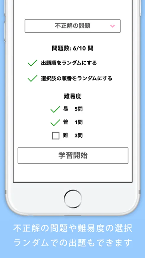 ・復習/自習では出題順や選択肢の表示時のランダム化が可能です