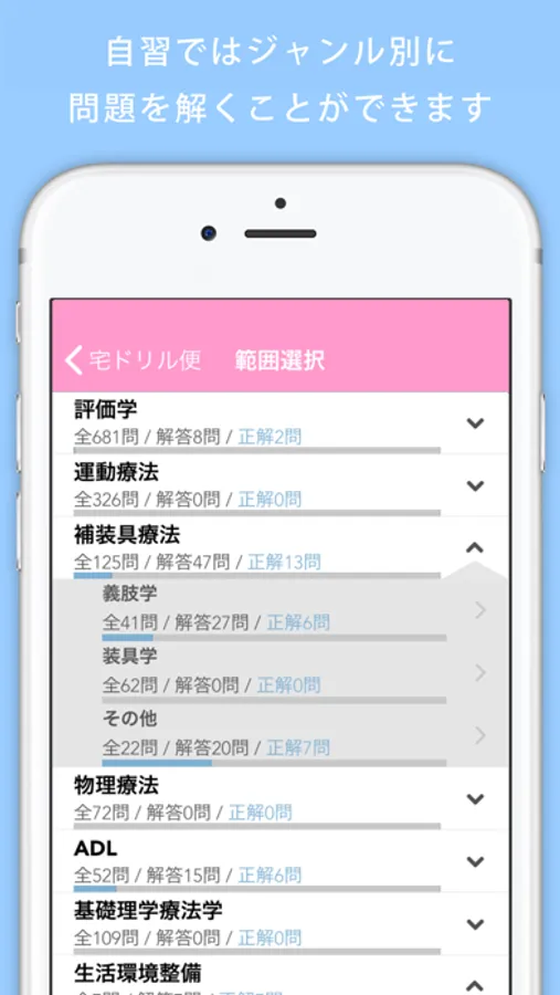 新たに追加された機能「自習」では、ジャンルごとに問題を解くことができます。