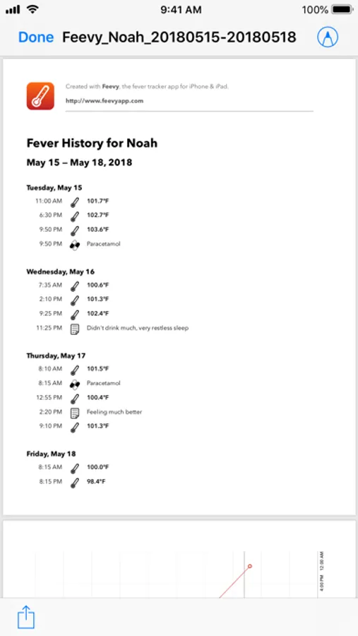 Of course you can also print and export your data. This way you can bring your fever curve with you to the doctor or even send it via e-mail. The PDF contains all measurements, medications and notes, as well as a full-page chart showing the temperature curve.