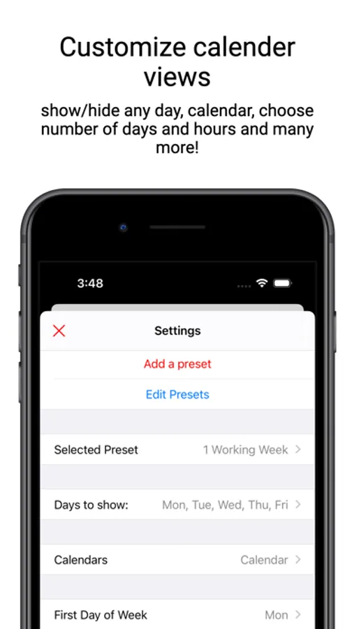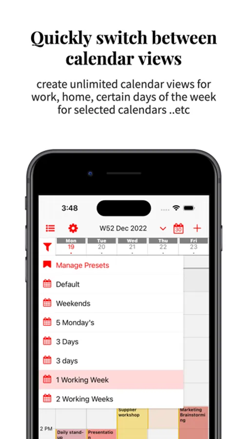 A different approach to working with calendars. Fully customizable week calendar to link all your calendars to. Week Calendar Pro allows you to fully customize what you what to see on your calendar through a nice drop down preset (calendar views) that you can quickly switch between.
