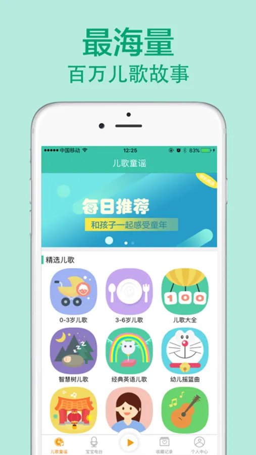 儿歌大全,适合0-6岁幼教儿歌故事大全,经典动画主题曲,和孩子一起感受童年。宝宝成长阶段的最佳精神营养。
