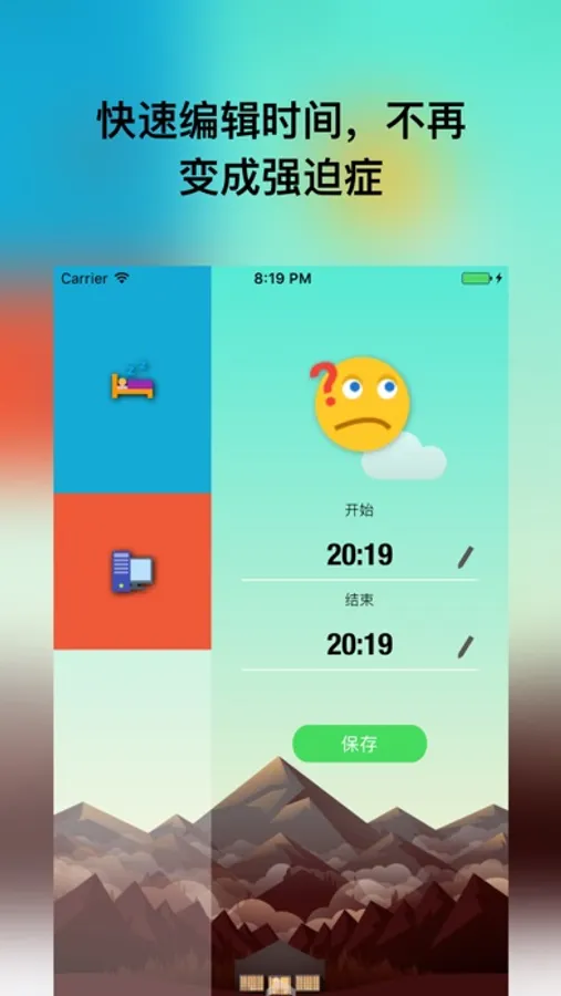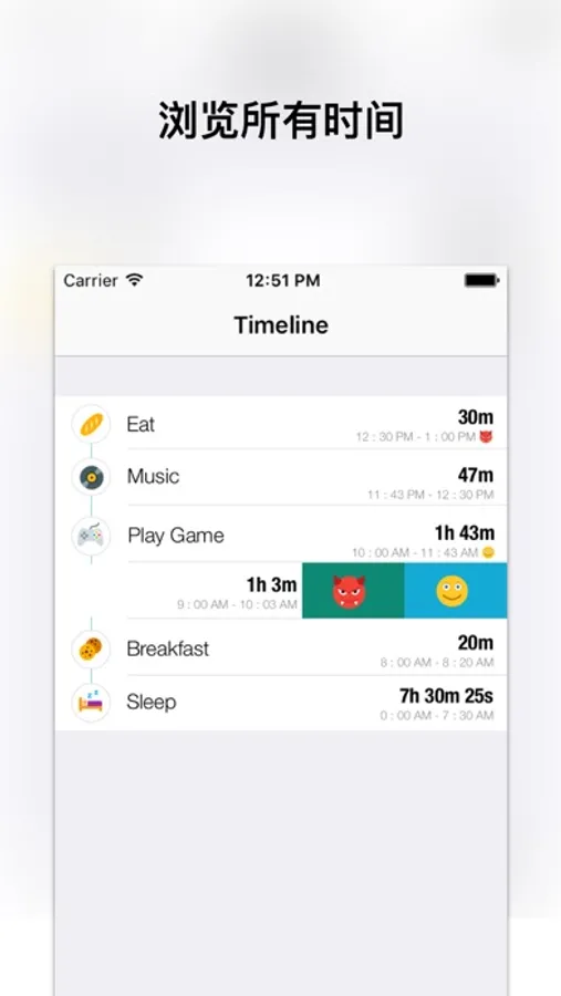 轻触生成不同的任务,在点击中跟踪你的时间,以「怪兽」和「笑脸」来评价每段时间。