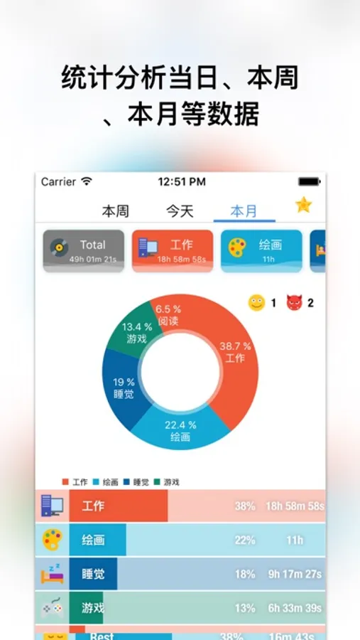 可视化的图表统计每日、每周和每月的时间消耗,让时间管理更清晰,依靠负罪感推动你的时间线转动。