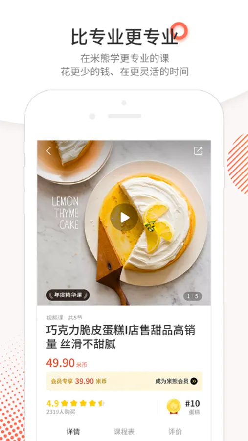 * 课程专业优质:米熊将职业兴趣教育和视频技术融合的平台,讲师包括美食大咖、艺术名流、功夫明星,法国国宝级甜品及糖艺大师Olivier Bajard、2015甜点世界冠军Emmanuele Forcone、MOF大师Roland Del Monte、受到法国总统表彰并授予勋章的Philippe、面包MOF Schwalbach、日本面包泰斗小仓孝树等数十位世界级美食大咖,他们开展线上直播授课,并产生了精彩卓绝的回放视频,都在等你发现;