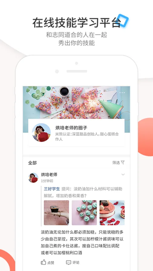 * 与专业老师互动:参与课程前可向老师咨询关于课程的疑问;参与课程后将及时收到课程开播的通知;参与直播中可以与老师和同学互动,并可任意观看回放;还可以加入老师的群组,与老师持续沟通;