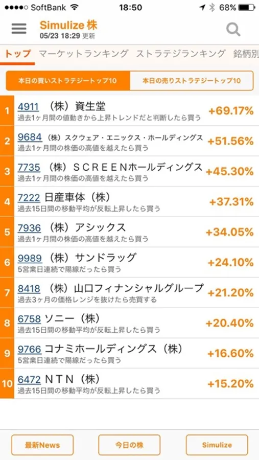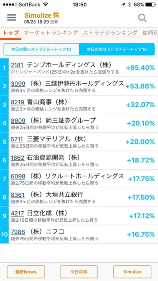 毎日平日の夜8時にその日の株価の終わり値をもとにしたシミュレーション計算がアップされます。明日の市場で売りサイン、買いサインが出ている上位の銘柄を見ます。