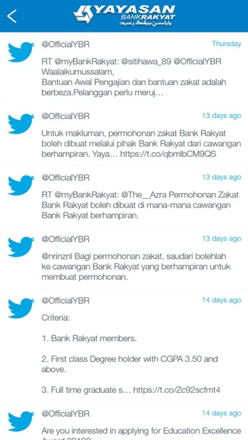 - YBR Information - View information of daily activities provided by YBR though various events and activities such as Didik Rakyat, Kembara Muda Rakyat and many more.