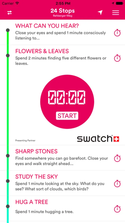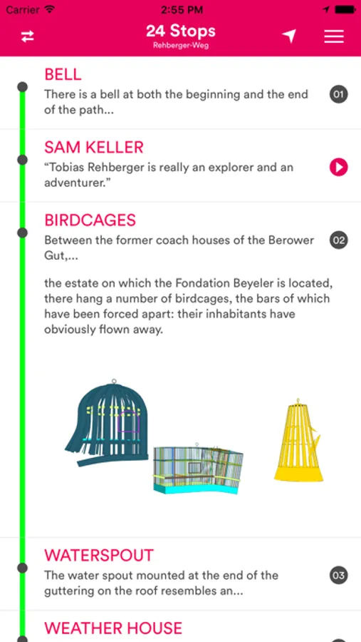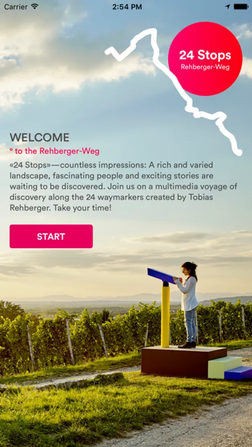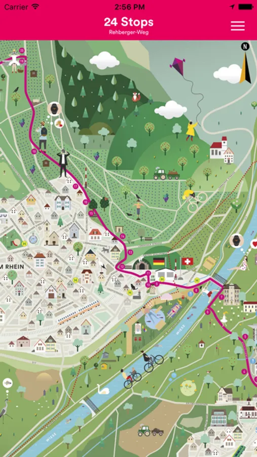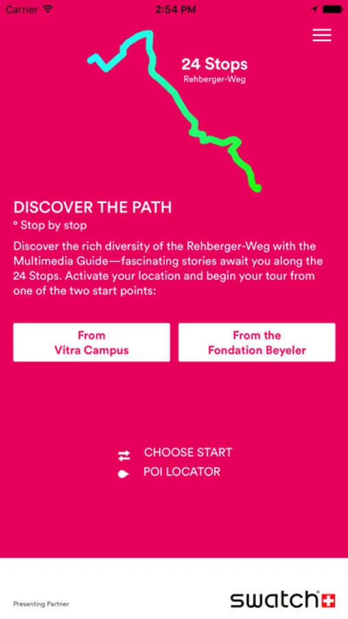 The Rehberger-Weg with its 24 brightly coloured way markers designed by the artist Tobias Rehberger links two countries, two municipalities, two cultural institutions – and countless stories. The «24 Stops» app permits a multimedial experience of the Rehberger-Weg. An audio-guide, short videos, humorous assignments and complementary texts assure a varied an entertaining walk along the path between Weil am Rhein and Riehen, between the Vitra Campus and the Fondation Beyeler.