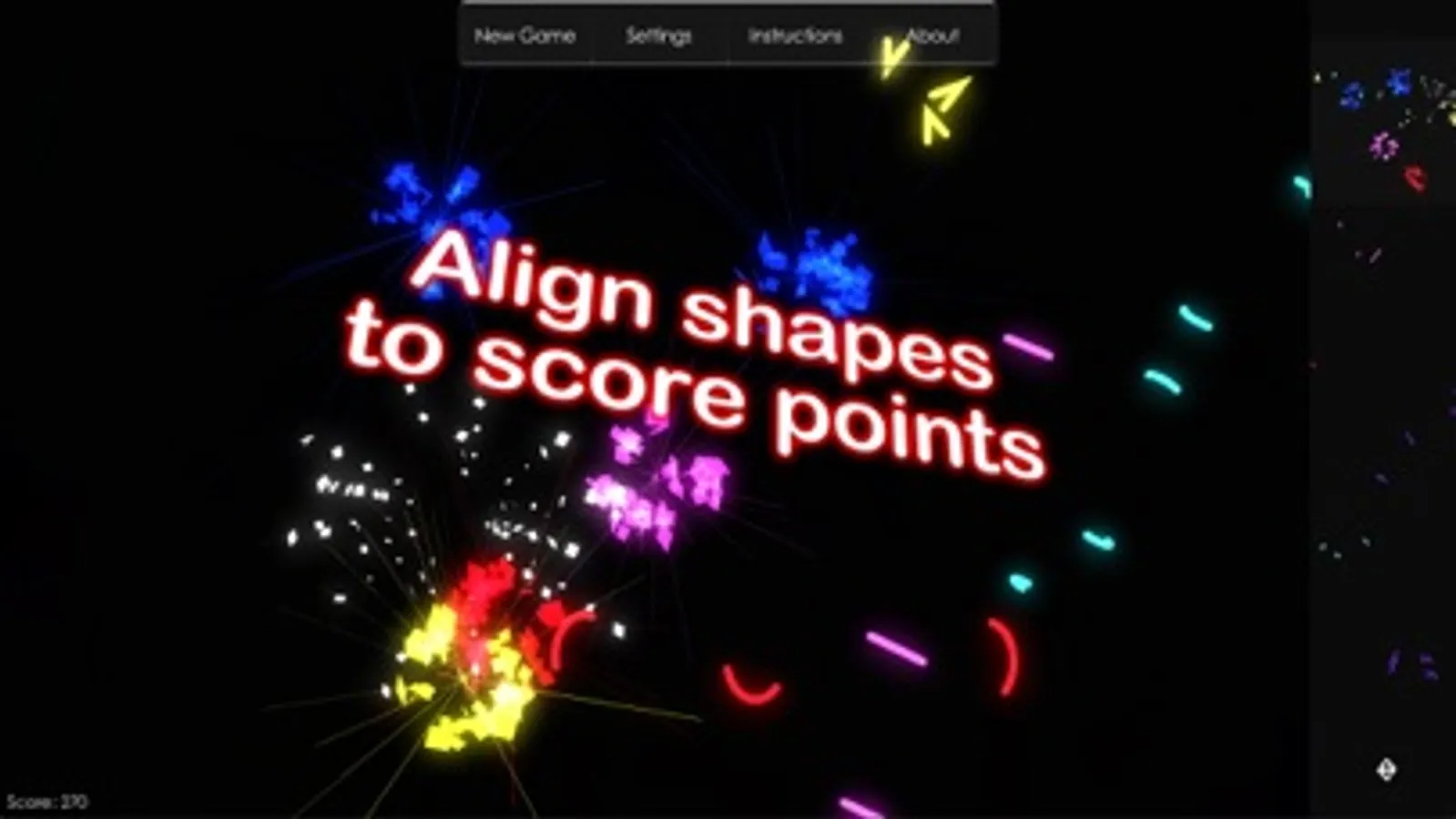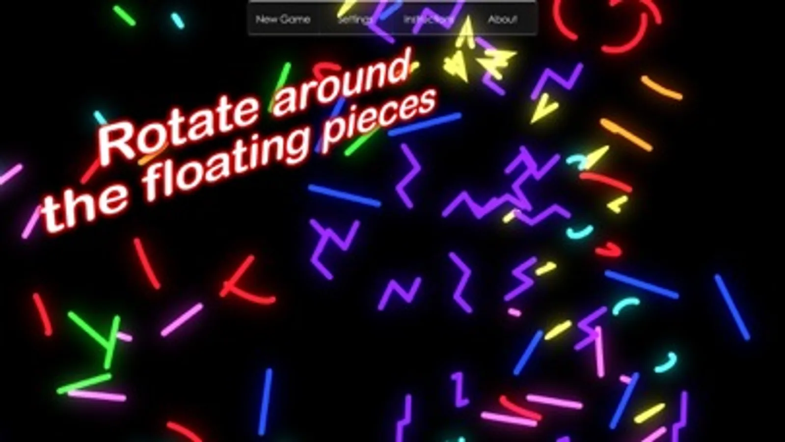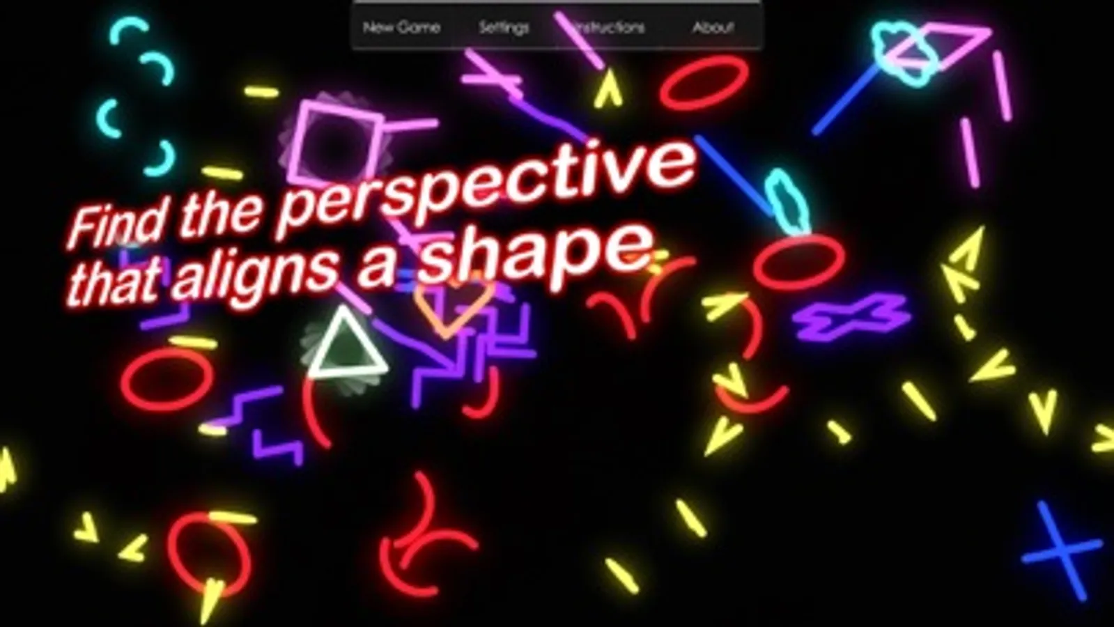 A mind blowing puzzle game that challenges your spatial abilities. Simple shapes are spread apart in pieces floating in a 3D space, and there is a camera angle that aligns all pieces and builds each shape. The game is played by rotating the camera around to find such angles and build shapes. When shapes are built they are removed and points get scored.