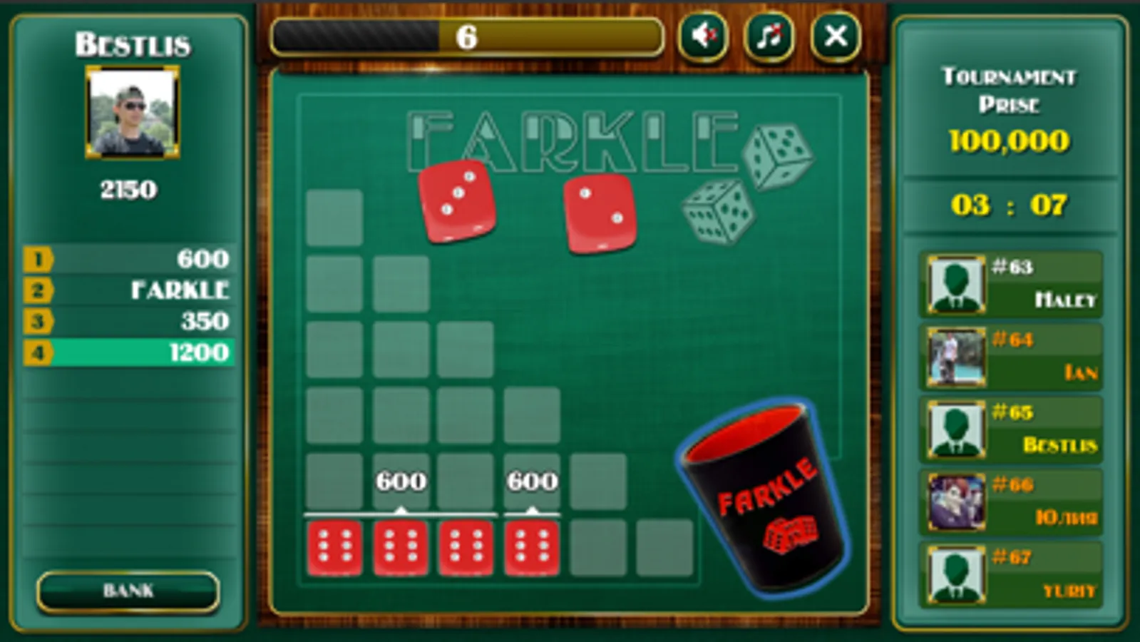 In a tournament you have possibility to compete in real time with players around the world and to prove that you are the best Farkle player.