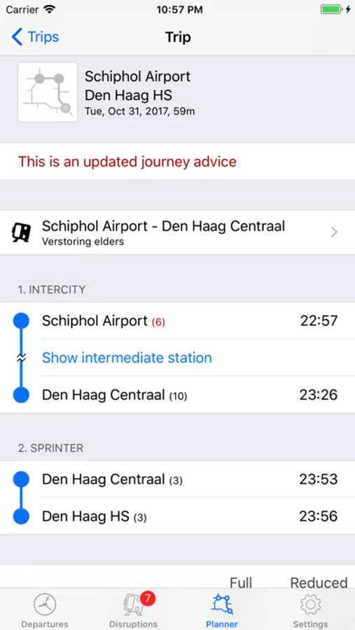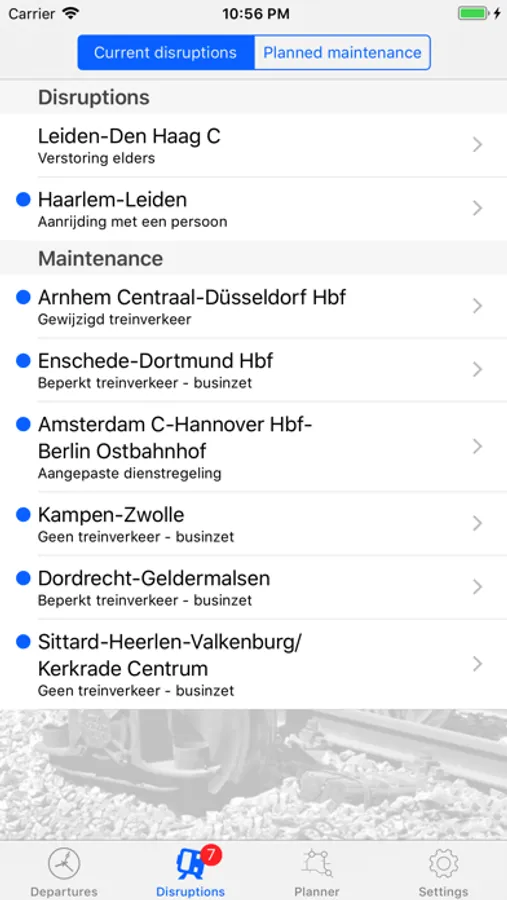 Get a quick overview of current disruptions and maintenance works for all routes and train stations in The Netherlands. Trein shows cause and effects for these disruptions, changes and advices are automatically updated.