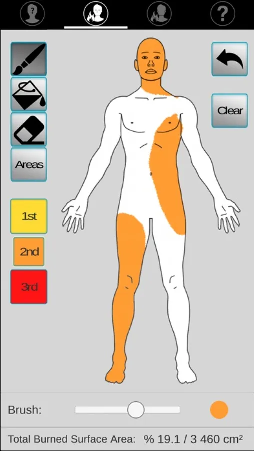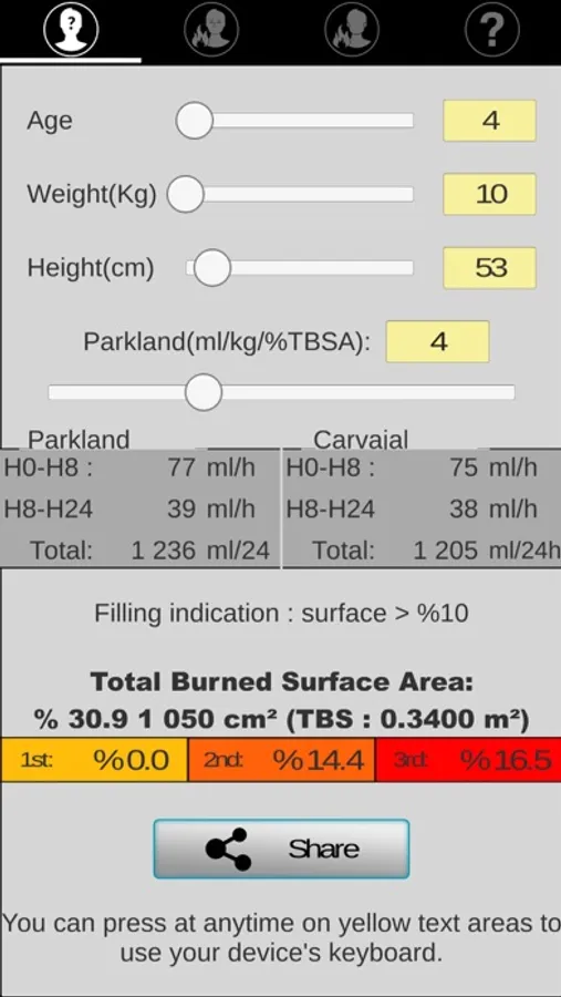 Application aimed at guiding initial fluid management (adult or child) after drawing the burned surface on a template (Lund and Browder chart).