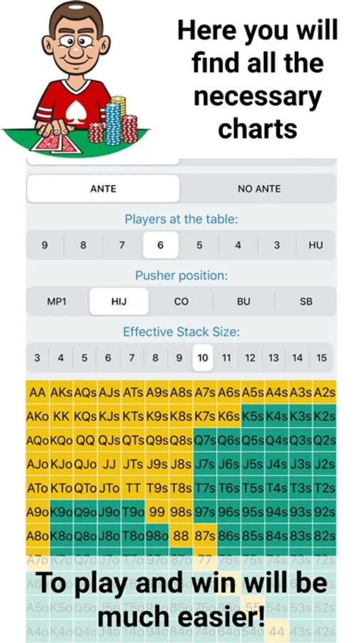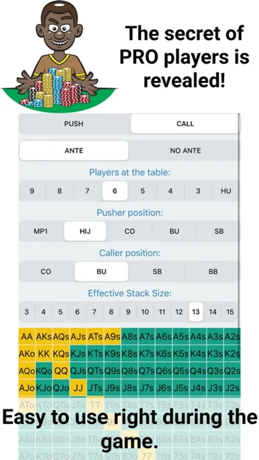 The Push Helper app is based on the Nash equilibrium and shows all of the profitable push or call ranges.