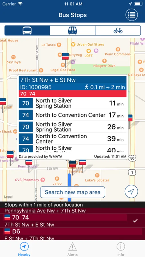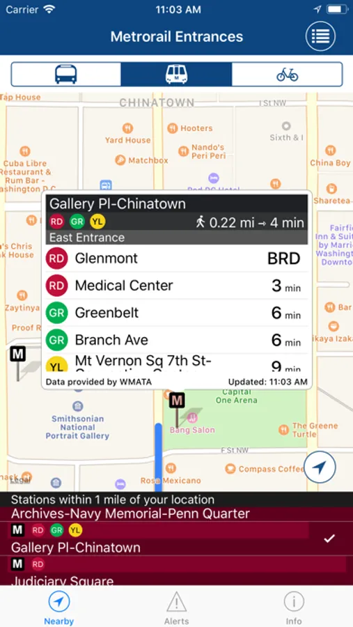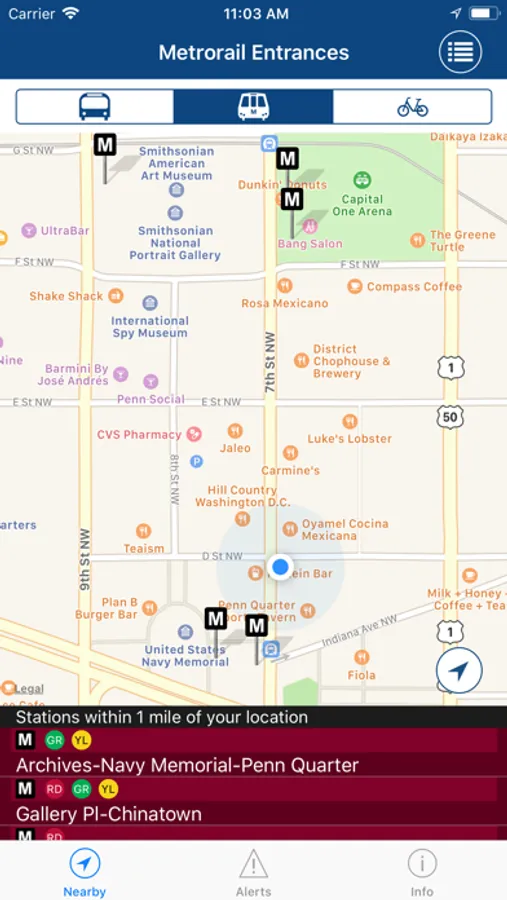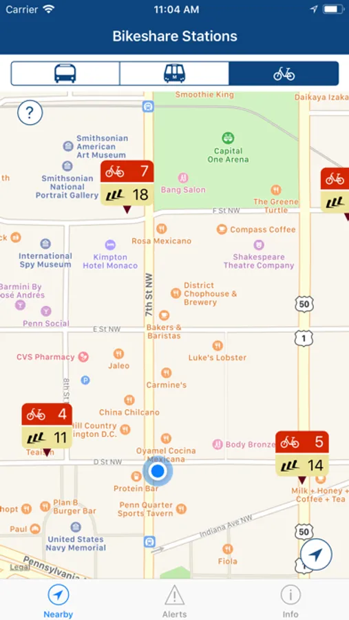 • See closest locations of DC metro station entrances, bus stops, and Capital Bikeshare stations with available number of bikes and empty docks.