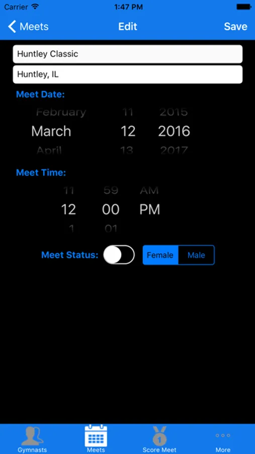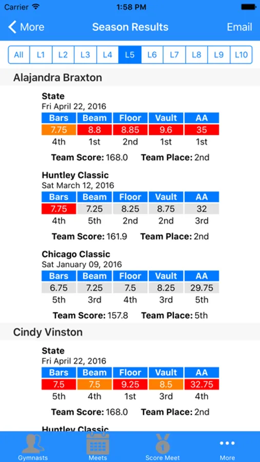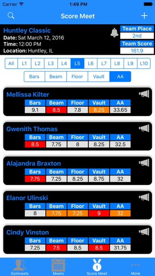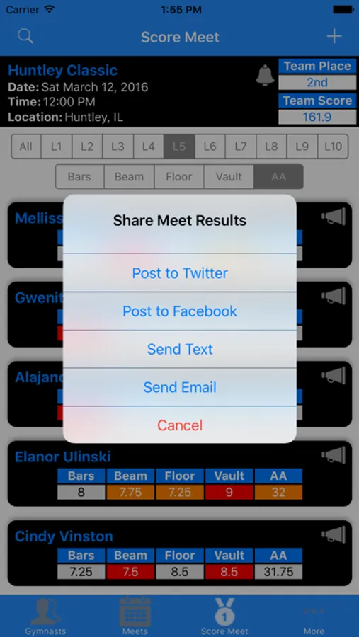 The "Score Meet" tab allows you to enter scores for the events. Setting the meet to (male/female) will give you events specific to the gender of the gymnast. You have the option to enter team places per level and the team score is calculated automatically. You also have an option to post individual scores to social media or email or text specific family and friends. High scores and matching high scores per level are highlighted.