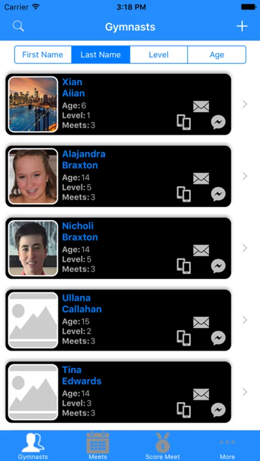 The "Gymnasts" tab allows you too enter gymnasts information such as name, age, level, picture, contact info and whether the gymnast is active. Entering contact info allows for easy one click call, text or email of gymnast or gymnast parent. The gymnasts can be sorted by first and last name, level and age. You can also search by first and last name.