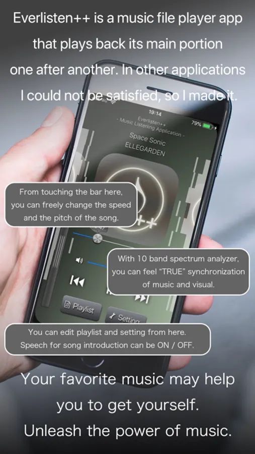 Are you making the best of your music files? Using Everlisten++, you can listen to the main portion of the music one after another. Since it corresponds to background playback, you can listen to the music while doing some work, and the efficiency of the work may increase.