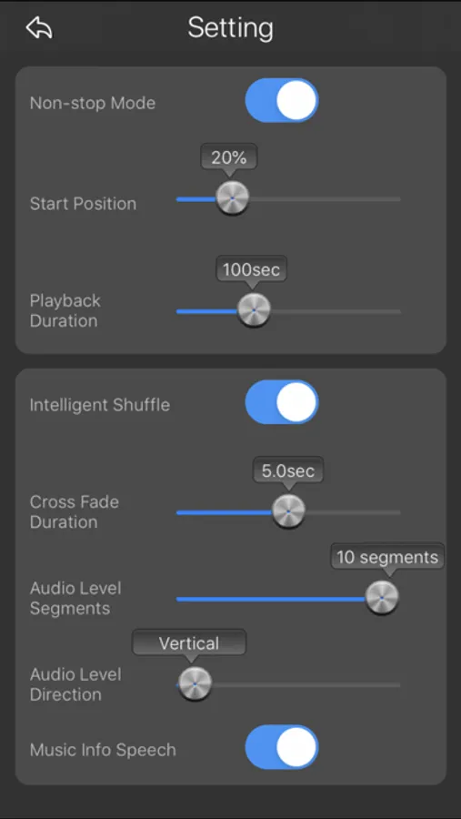 It's usage is up to you. At first, let's create a playlist. You can add the music from your iTunes library to the playlist. This application plays a music from the "Start Position", and it plays a music for "Playback Duration”. For example, if you made a setup playback 30 seconds respectively, you can listen to 100 musics in 50 minutes of commuting time. And you may discover a new charm which you have never known in many musics.