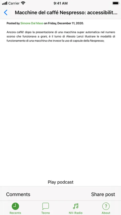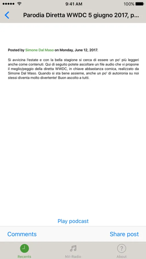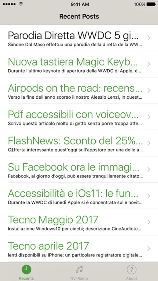 Born in December 2013, NVApple is a website aimed to inform Italian people about built-in Apple products assistive technologies that make them usable by people with disabilities. Through podcasts, tutorials and manuals, in our website we provide a lot of materials to make blind people use Apple products from the very basic scenarios (i.e. deciding what products to buy according to specific needs, getting the products out of their boxes and turning them on for the first time) to the most specific scenarios (i.e. using various programming tools, customizing advanced settings and performing every kind of system maintenance task).