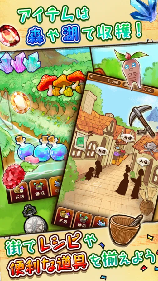 森や湖で素材を収穫し、レシピを元に組み合わせて