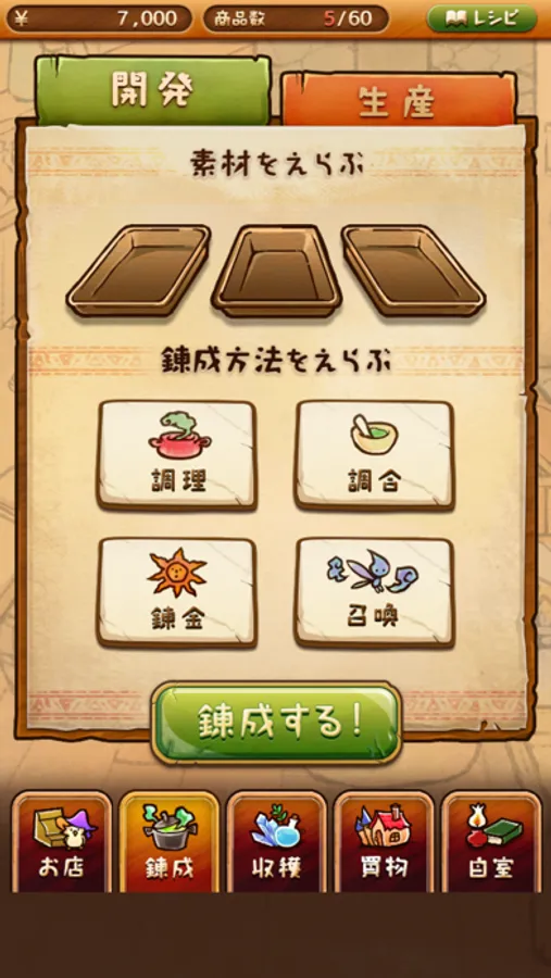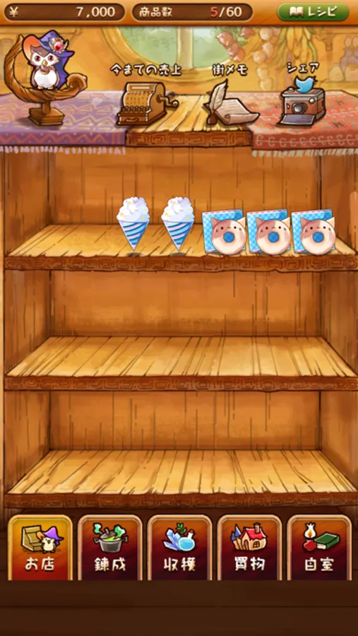 商店街では、足りない素材やレシピを買い足したり、