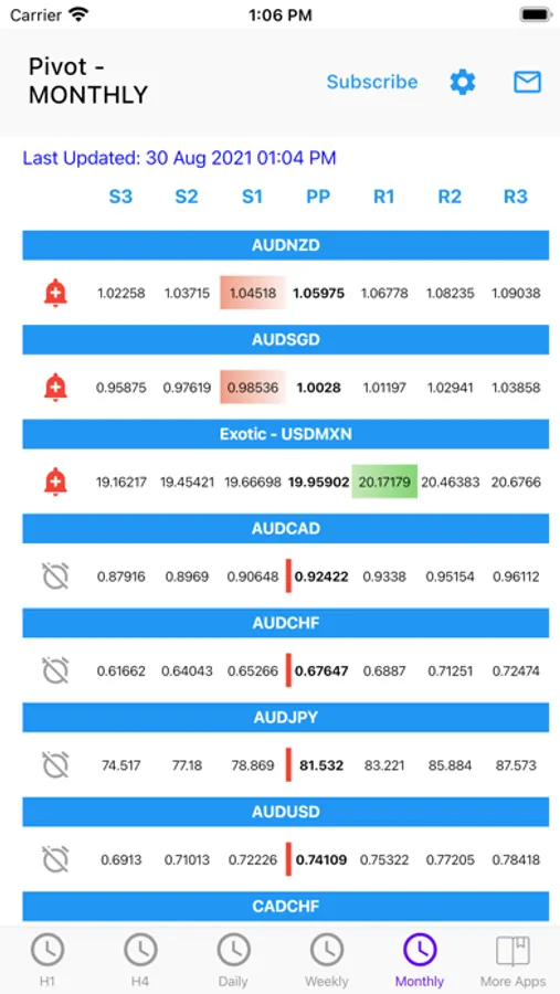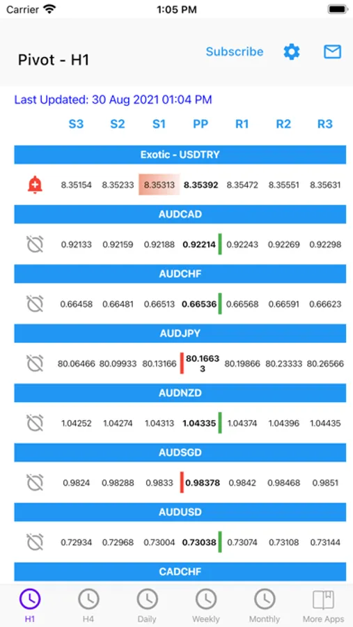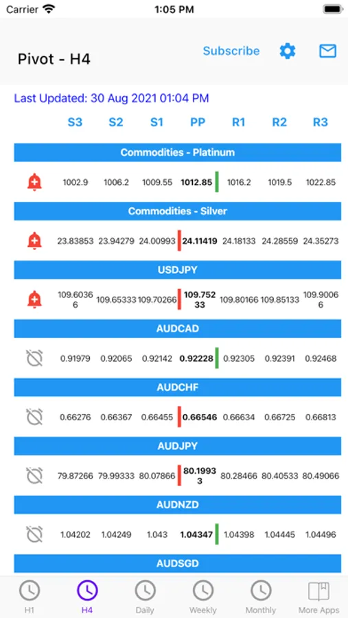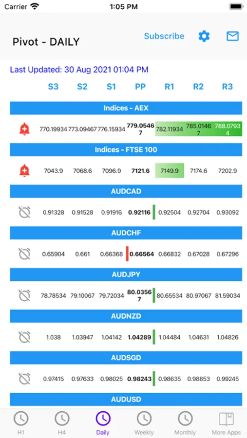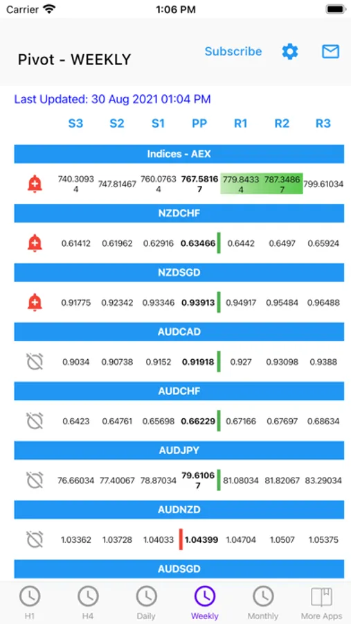 - Timely display of pivot points with 3 levels of support and resistance for various instruments which includes currency pairs, commodities, indices and exotic pairs,