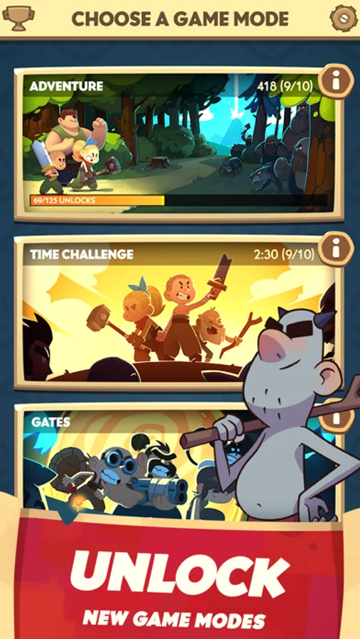 Your Almost Heroes keep unlocking new game modes for you to send them on. While a few Heroes are battling epic bosses in the Adventure mode, test your strategic might in timed trials! There are also weekly Seasons with tough challenges for only the foolhardy. Thankfully, you can take pets like a sheep, an armadillo, and even a spectacularly dumb pigeon into battle.