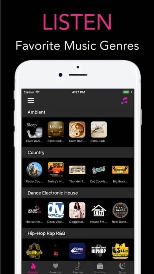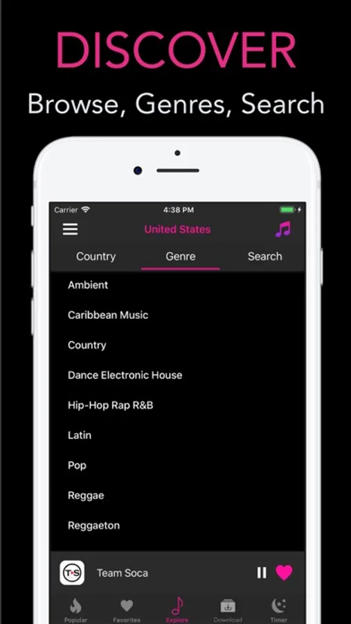 - Browse the worldwide catalog per Country or per Genre (Pop, Rock, Hip Hop, Latin, Country, Relax ...)
