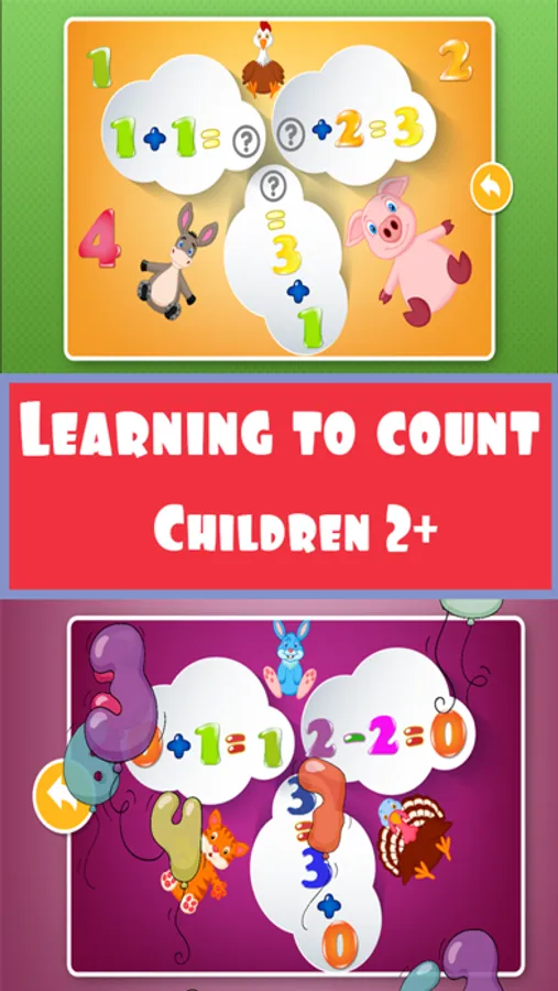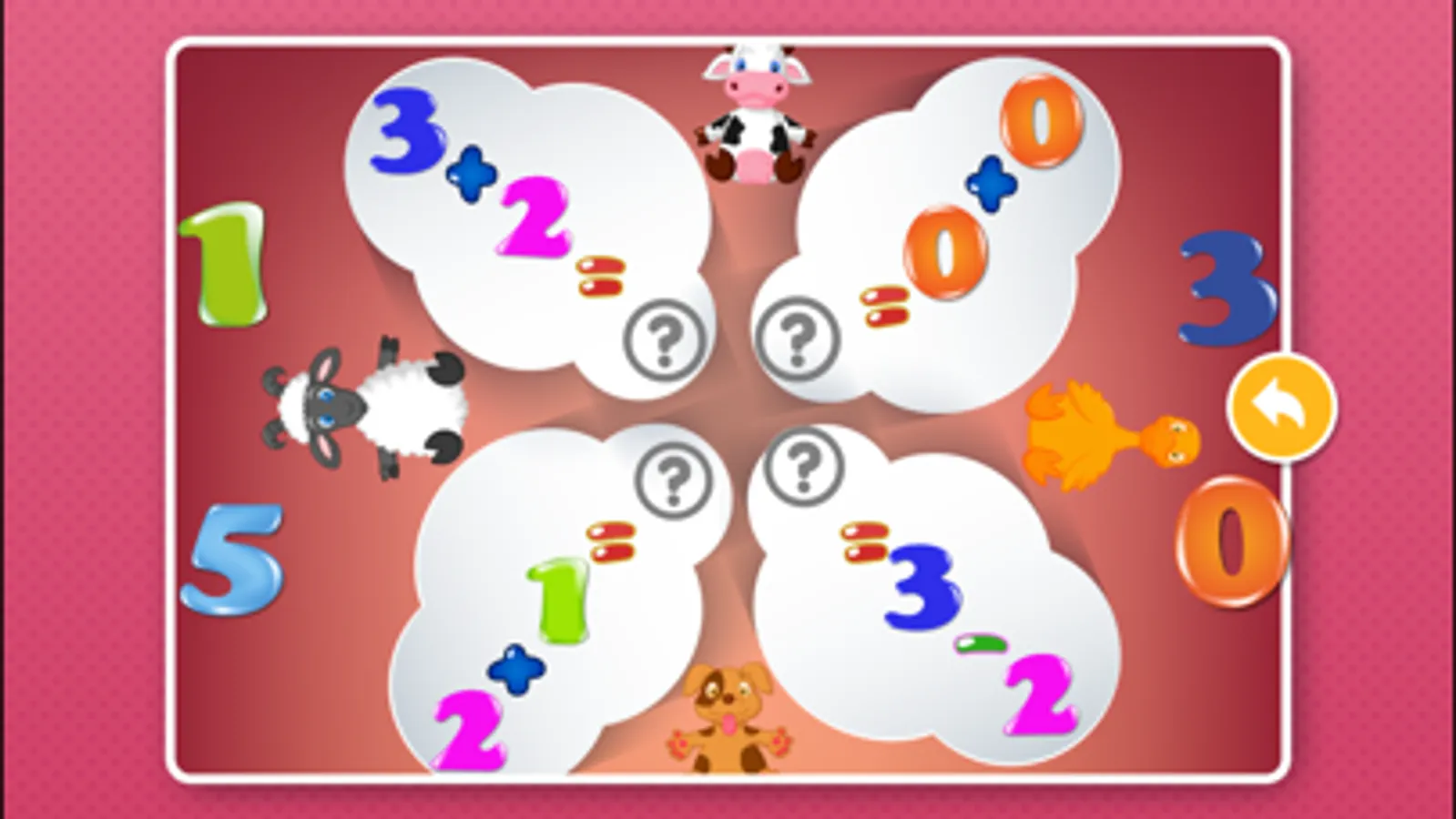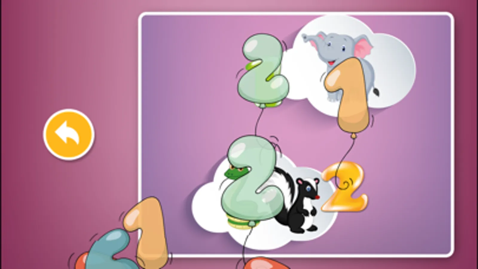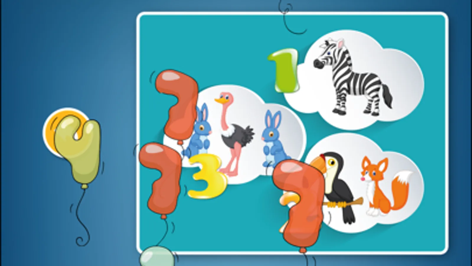 In the first level the child learns to match the figures with their quantification by solving 12 educating cards with colourful figures and lovely animals. The pleasant melodies accompany the game process with an option to switch them off. The balloons appear in case of successful card’s completeness witch are so attractive to pop. This level is for young pre-schoolers.