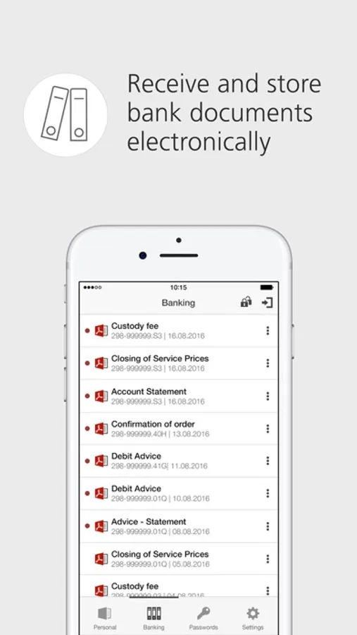 - Accessible using the Access App, Access Card, password or Touch/Face ID: you determine the protection level for personal documents and passwords