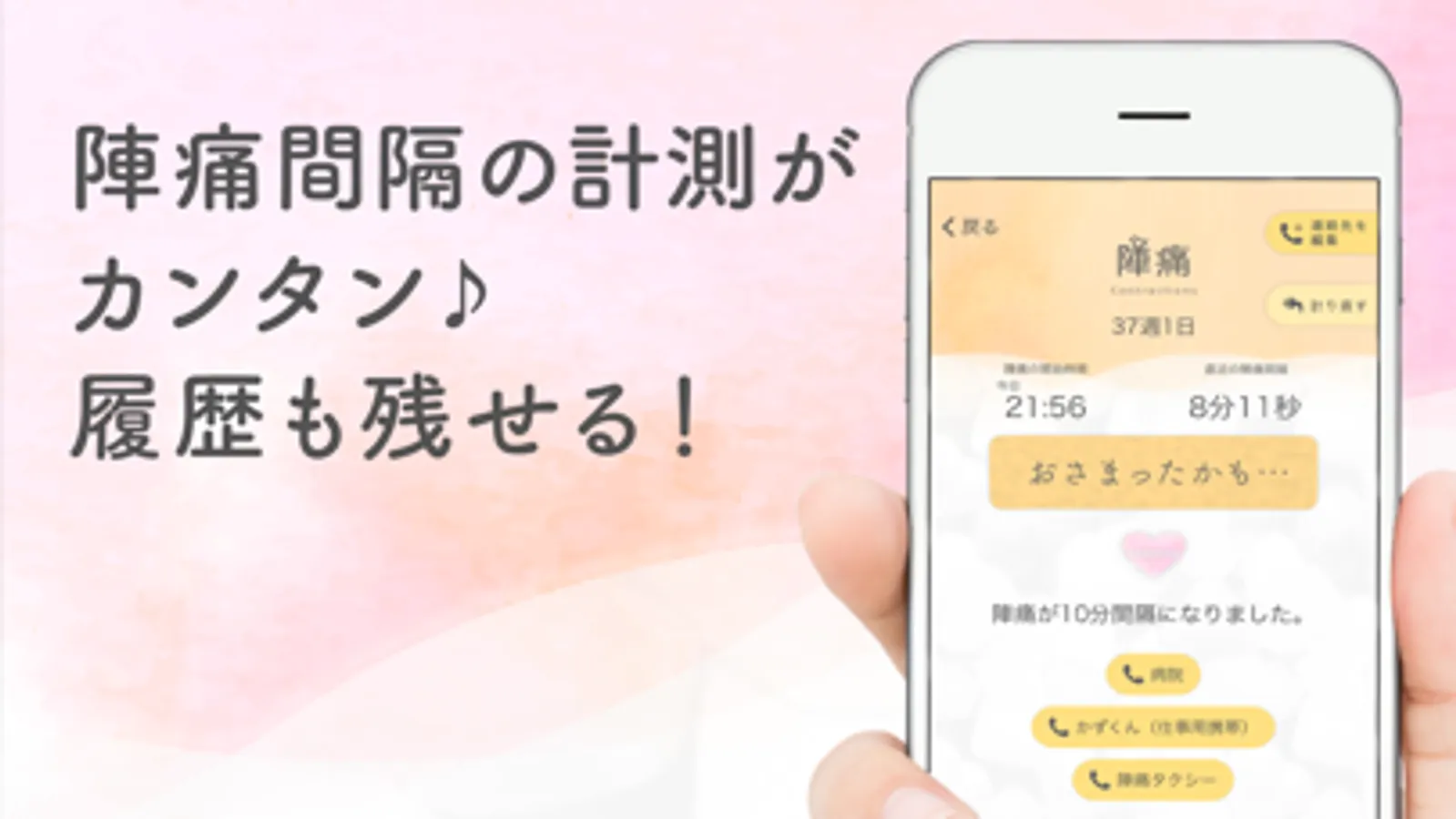 病院に連絡した際に伝える「陣痛開始時間」「妊娠週数」「直近の陣痛間隔」が一目でわかります。