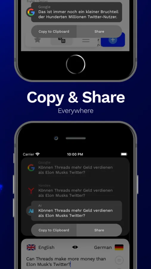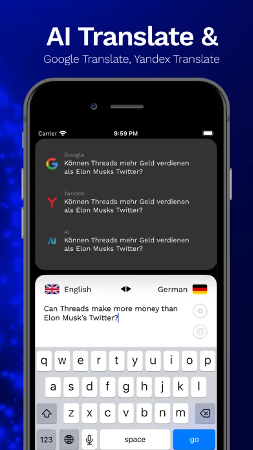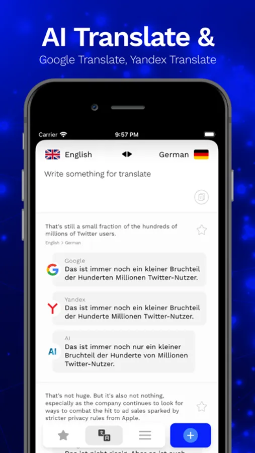 Translate AI Pro is the ultimate all-in-one translation app, providing seamless access to Google Translate, Yandex Translate, and AI Translate in a single platform.