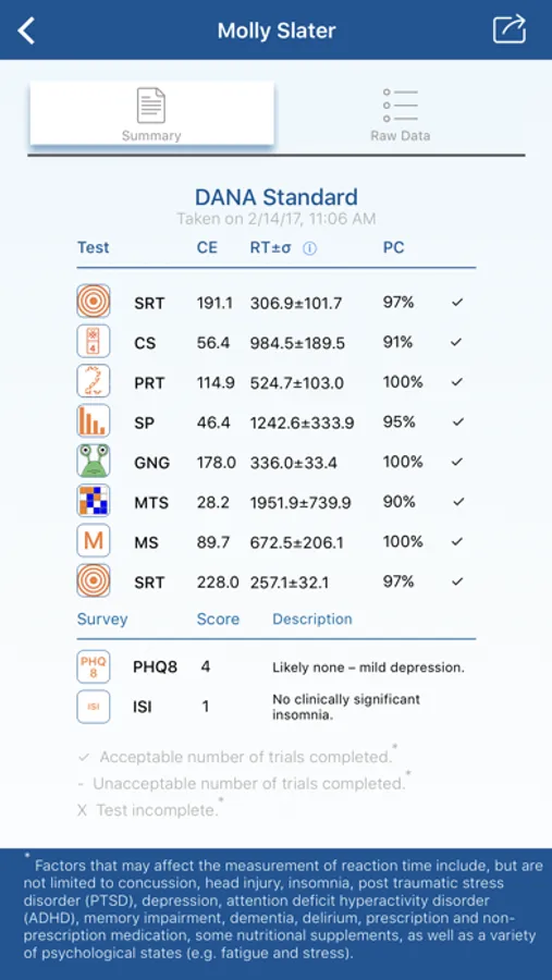 The FDA-cleared DANA platform consists of a suite of 8 cognitive tests and 10 psychological surveys. In addition to custom test creation the app includes both the DANA Brain Vital and DANA Standard assessments. All results can be viewed within the app or via the DANA web portal.