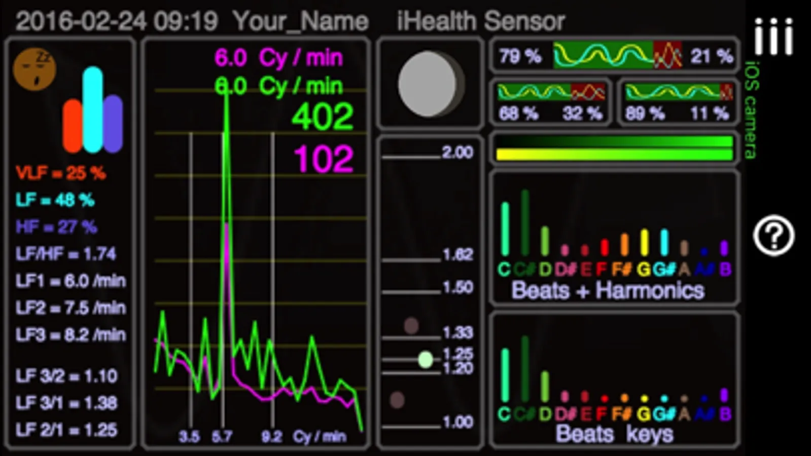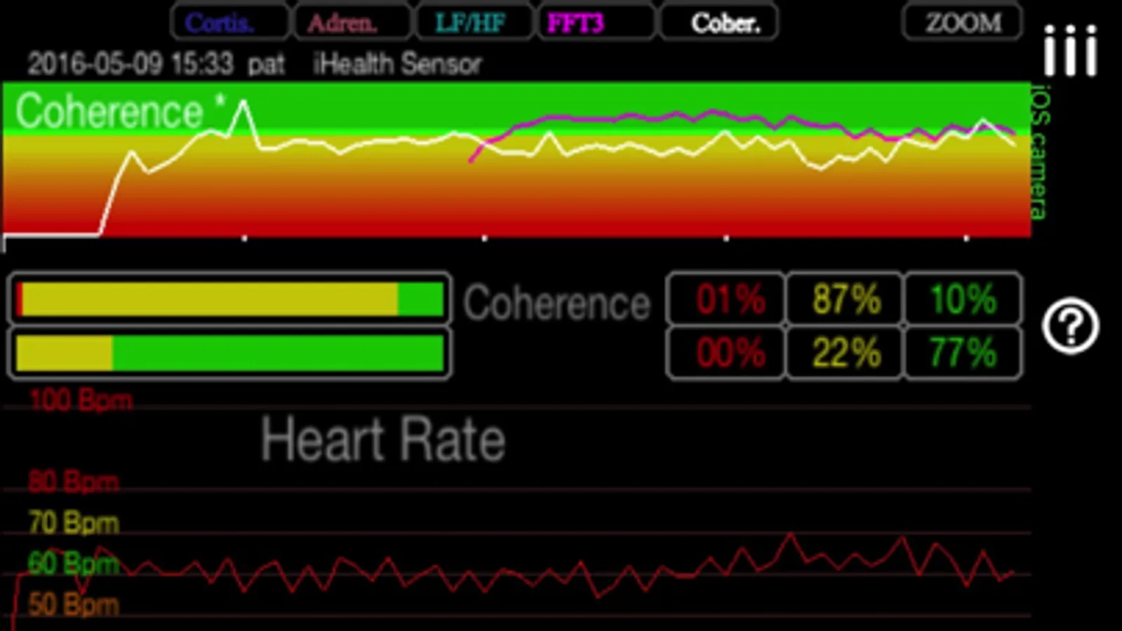 iTHRVE is a truly corporate capable way to do STRESS ANALYSIS and state of the art – Heart COHERENCE analysis with conventional and breakthrough 3rd order FFT (Fast Fourier Transform analysis) Coherence training. iTHRVE software capabilities walk circles around HeartMath and other HRV iOS apps – both in terms of sophistication of data analysis, breakthrough techniques to measure your heart coherence and stress (and blood oxygen), data sharing and number of different supported hardware input options to conveniently input state of the art – HRV training for iPhone.
